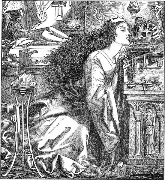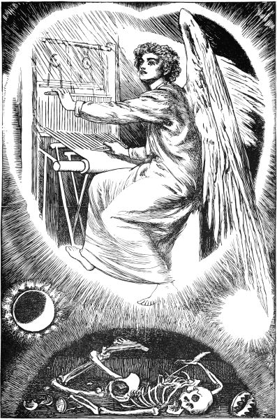 'The Tennyson designs, which were engraved on wood and published in the Illustrated Tennyson, in which Millais, Hunt, Mulready, and others co-operated,' says Mr. William Michael Rossetti, 'have in159 the long run done not a little to sustain my brother's reputation with the public. At the time they gave him endless trouble and small satisfaction. Not indeed that the invention or the mere designing of these works was troublesome to him. He took great pains with them, but, as what he wrought at was always something which informed and glowed in his mind, he was not more tribulated by these than by other drawings. It must be said, also, that himself only, and not Tennyson, was his guide. He drew just what he chose, taking from his author's text nothing more than a hint and an opportunity. The trouble came in with the engraver and the publisher. With some of the doings of the engraver, Dalziel (not Linton, whom he found much more conformable to his notion), he was grievously disappointed. He probably exasperated Dalziel, and Dalziel certainly exasperated him. Blocks were re-worked upon and proofs sent back with vigour. The publisher, Mr. Moxon, was a still severer affliction. He called and he wrote. Rossetti was not always up to time, though he tried his best to be so. In other instances he was up to time, but his engraver was not up to his mark. I believe that poor Moxon suffered much, and that soon afterwards he died; but I do not lay any real blame on my brother, who worked strenuously and well. As to our great poet Tennyson, who also ought to have counted for something in the whole affair, I gather that he really liked Rossetti's designs when he saw them, and he was not without a perceptible liking and regard for Rossetti himself, so far as he knew him (they had first met at Mr. Patmore's house in December 1849); but the illustration to St. Cecilia puzzled him not a little, and he had to give up the problem of what it had to do with his work.'9
