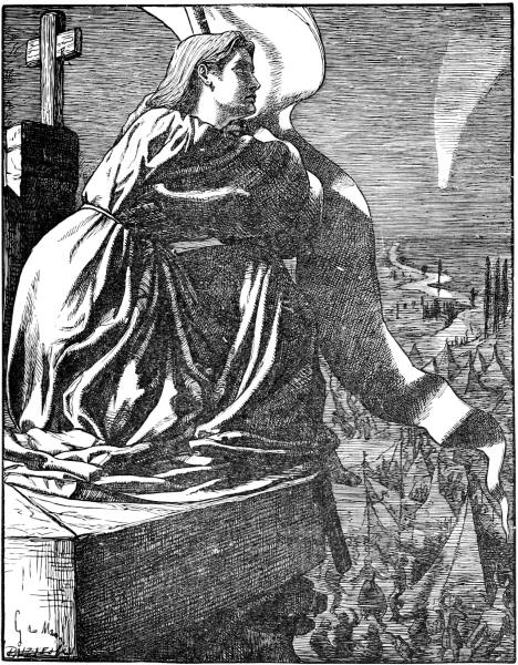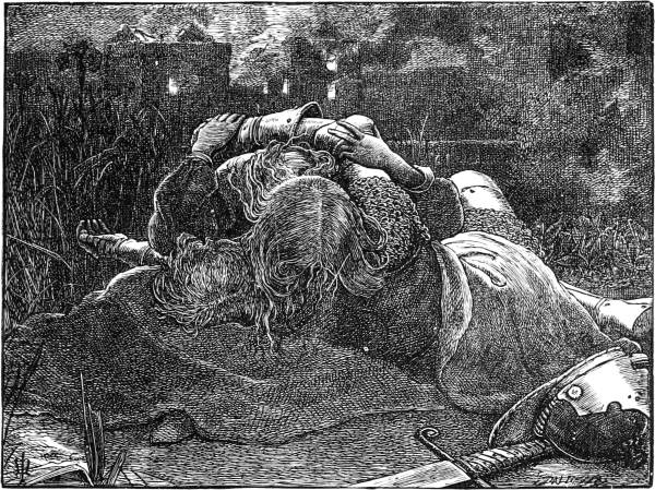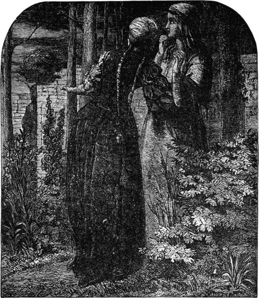 Sir John Everett Millais, Bart., P.R.A. (born June 8, 1829, died August 13, 1896).—As these proofs were being sent to press, the greatest illustrator of all (having regard to his place as the pioneer of the school which immediately succeeded the pre-Raphaelites, the number of his designs, and their superlative excellence), has joined the majority of his fellow-workers in the sixties. It would be impossible in a few lines to summarise his contributions to the 'black-and-white' of English art; that task will doubtless be undertaken adequately. But, if all the rest of the work of the period were157 lost, his contributions alone might justly support every word that has been or will be said in praise of 'the golden decade.' From the 1857 Tennyson to his latest illustration he added masterpiece to masterpiece, and, were his triumphant career as a painter completely ignored, might yet be ranked as a great master on the strength of these alone.