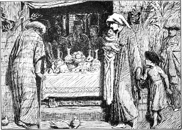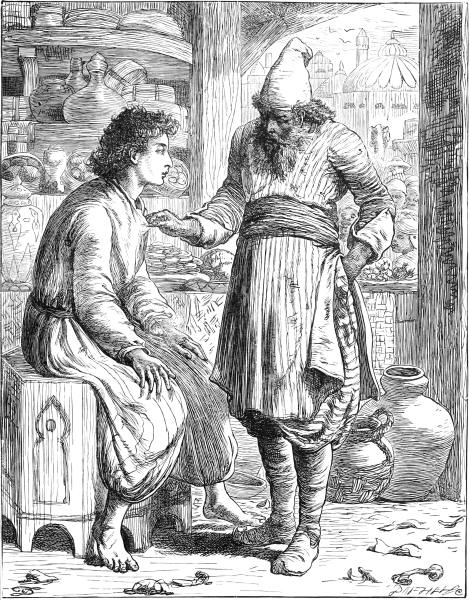 Arthur Boyd Houghton (1836–1875) was born in 1836, the fourth son of his father, who was a captain in the Royal Navy. He visited India, according to some of his biographers; others say that he was never in the East, but that it was a brother who supplied him with the oriental details that appear in so many of his drawings. Be that as it may, his fellow-workers on the Arabian Nights pretended to be jealous of his Egyptian experience, and declared that it was no good trying to rival from their imaginings the scenes that he knew by heart.164 At present, when all men unite to praise him, it would almost lend colour to a belief that he was unappreciated by his fellows to read in a contemporary criticism: 'His designs were often striking in their effects of black and white, but were wanting in tone and gradation—a defect partly due to the loss of one eye.' This is only quoted by way of encouragement to living illustrators, who forget that their hero, despite sympathy and commissions, suffered also much the same misunderstanding that is often their lot. Against this may be set a criticism of yesterday, which runs:—