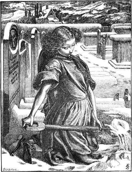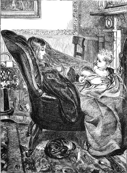 Good Words in 1869 contains two drawings to Carmina Nuptialia, and The Sunday Magazine the same year has a very beautiful composition, Blessings in Disguise. In 1870–1871 Good Words for the Young includes, in the first two volumes, no less than seventy-six illustrations by Mr. Hughes to At the Back of the North Wind, fourteen to The Boy in Grey, thirty to Ranald Bannerman's Boyhood, thirty to The Princess and Goblin, ten to Lilliput Revels, six to Lilliput Lectures, and two to King Arthur, besides one each to Fancy, The Mariner's Cave, and a notable design to The Wind and the Moon. In 1871 also belongs My Lady Wind (p. 38), Little Tommy Tucker (p. 46), in Novello's National Nursery Rhymes.