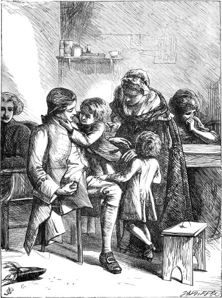 Frederick Walker13 (1840–1875), who was born in Marylebone on the 26th of May 1840, has been the subject of so many appreciations, and at least one admirable monograph, that a most brief notice of his career as an illustrator will suffice here. His father was a designer of jewelry and his grandfather had some skill in portrait-painting. How he began drawing from the Elgin marbles in the British Museum at the age of sixteen has been told often enough. Many boys of sixteen have done the same, but it is open to doubt if any one of them has absorbed the spirit of their models so completely as Fred Walker did. It would be hardly asserting too much to say for him that they replaced humanity, and that his male figures seem nearly always youths from the Parthenon in peasant costume. At seventeen or eighteen he was working at Leigh's life-class in Newman Street, and at the same time was employed in Mr. Whymper's wood-engraving establishment. His first appearance in Everybody's Journal is duly noted elsewhere, also his first drawing in Once a Week; but the peculiar affection he had inspired by his work has kept most of his critics from saying that some of his earliest designs, as we know them after engraving, appear distinctly poor. But, from the time he ceased to act as 'ghost' for Thackeray, and signed his work with the familiar F. W., his career shows a distinct and sustained advance until the ill-fated 1875, in which George Mason, G. J. Pinwell, and A. Boyd Houghton also died.
