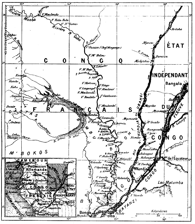 Après un court séjour à Lizzanga, poste situé au confluent de l'Oubangui et du Congo, et à Bonga, ancien poste de l'ouest africain, à l'embouchure de la Sangha, actuellement occupé par une factorerie française, nous partions à l'aventure dans cette rivière Sangha--citée par Jacques de Brazza, relevée pendant quelques milles par M. le capitaine de frégate Rouvier en 1886--par conséquent inconnue, mais soupçonnée devoir être un centre commercial des plus importants.
