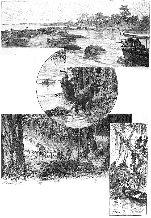 Un millier de ces pachydermes, surpris dans leur sommeil par des visiteurs inconnus, montrèrent plus d'étonnement que de crainte, et la prudence seule nous empêcha de leur envoyer quelques balles: car mis en fureur ils eussent bientôt fait de chavirer notre frêle embarcation.