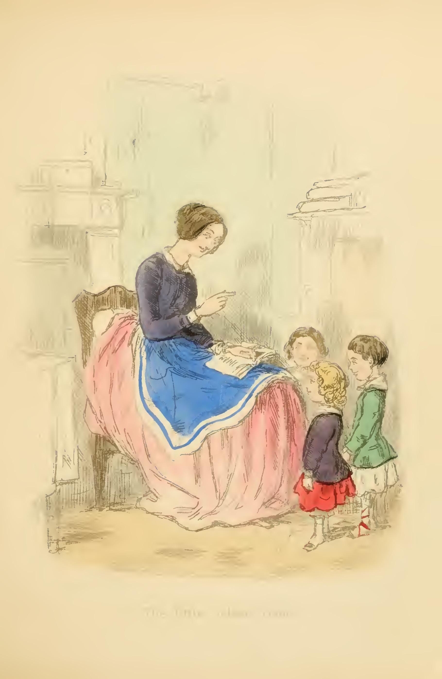 Though she is kind to all, it must be owned she shows the most gross favouritism towards the amiable children. She brings them cakes from dessert, and regales them with Zoe's preserves; spends many of her little shillings in presents for her favourites, and will tell them stories by the hour. She has one very sad story about a little boy, who died long ago; the younger children are never weary of hearing about him; and Miss Raby has shown to one of them a lock of the little chap's hair, which she keeps in her work-box to this day.