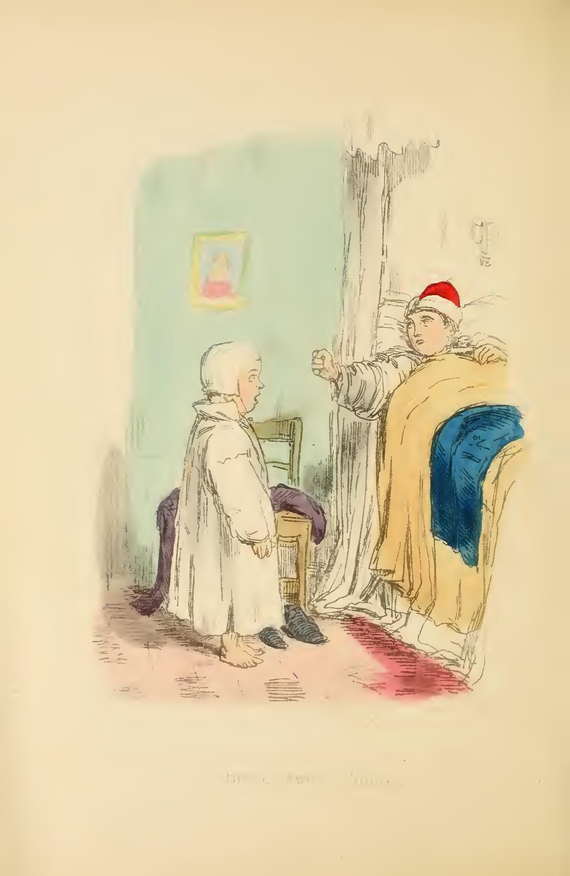 The Doctor is a pompous and outwardly severe man—but inwardly weak and easy: loving a joke and a glass of port wine. I get on with him, therefore, much better than Mr. Prince, who scorns him for an ass, and under whose keen eyes the worthy Doctor writhes like a convicted impostor; and many a sunshiny afternoon would he have said, "Mr. T., Sir, shall we try another glass of that yellow sealed wine which you seem to like?" (and which he likes even better than I do), had not the old harridan of a Zoe been down upon us, and insisted on turning me out with her miserable weak coffee. She a mother indeed! A sour milk generation she would have nursed. She is always croaking, scolding, bullying,—yowling at the housemaids, snarling at Miss Raby, bowwowing after the little boys, barking after the big ones. She knows how much every boy eats to an ounce; and her delight is to ply with fat the little ones who can't bear it, and with raw meat those who hate underdone. It was she who caused the Doctor to be eaten out three times; and nearly created a rebellion in the school because she insisted on his flogging Goliah Longman.