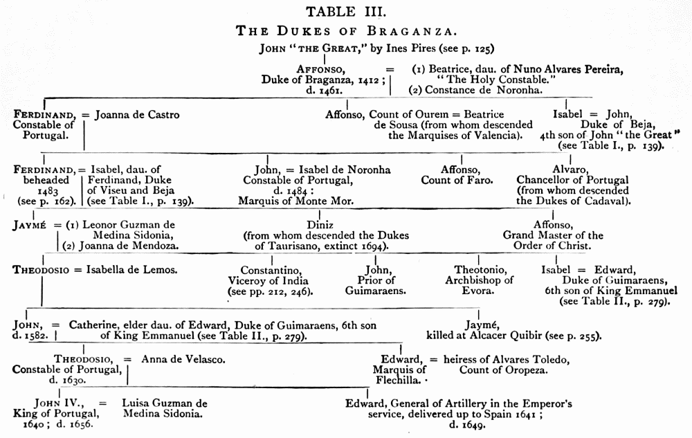 | John II. “the Perfect”—Overthrow of the power of the nobility—His foreign policy—Treaty of Tordesillas with Spain—Friendship with England—His encouragement of exploration—His court—Emmanuel “the Fortunate”—Expulsion of the Jews—His policy and marriages—The discoveries of the Portuguese—The seeds of decline—John III.—His policy—The abandonment of the ports in Morocco—Corruption at Court—Rapid depopulation of Portugal—The Inquisition and the Jesuits—Death John III.{xvi} | |