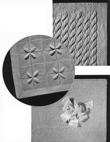 MATERIALS: 3 ply BEEHIVE NON-SHRINK BABY WOOL. 14 ozs. One No. 0 Steel Crochet Hook (American Gauge). 4½ yds. Silk Blanket Binding or Satin Ribbon 2 ins, wide. 1 yd. Ribbon 1 inch wide. 3 yds. Ribbon ¼-inch width.