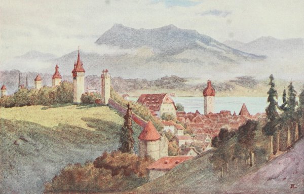 Sempach itself, like Sursee, is a picturesque old town, with another quaint old gateway. The lake, though five miles long, is quite outside the mountains, though the splintered crags of Pilatus give a distant hint of Alpine splendour. The remaining nine miles or so to Lucerne are perhaps a trifle dull, and the entrance to the city is through the usual straggling suburb—out of all reasonable proportion to the place itself—that conducts us too frequently to a town in Switzerland.