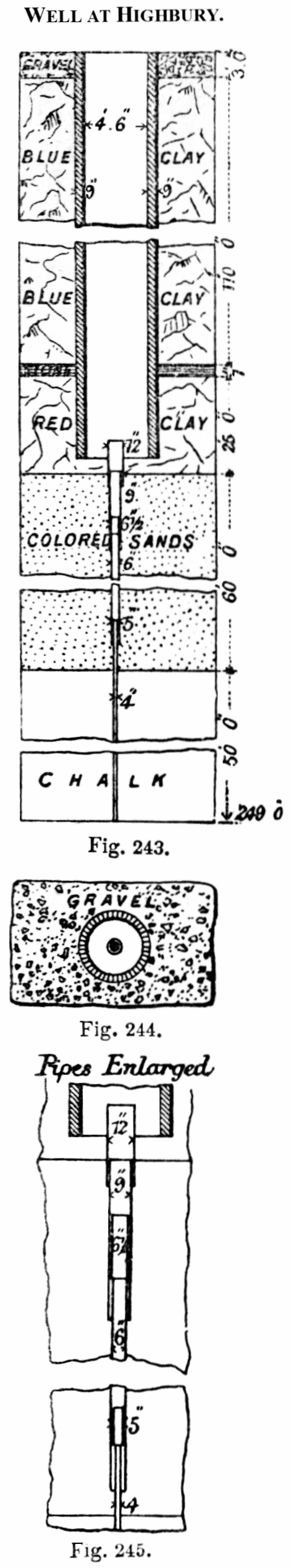It will be obvious how, in this way, by passing under a mass[7] of drift the water descending from the top of hill slopes reappears at their foot in the form of springs. If now we suppose these issues stopped, or covered by an impervious stratum of great thickness, and this stratum pierced by a boring, the water will ascend through this new outlet to a level above that of its original issue, in virtue of the head of water measured from the points at which the infiltration takes place to the point in which it is struck by the boring.
