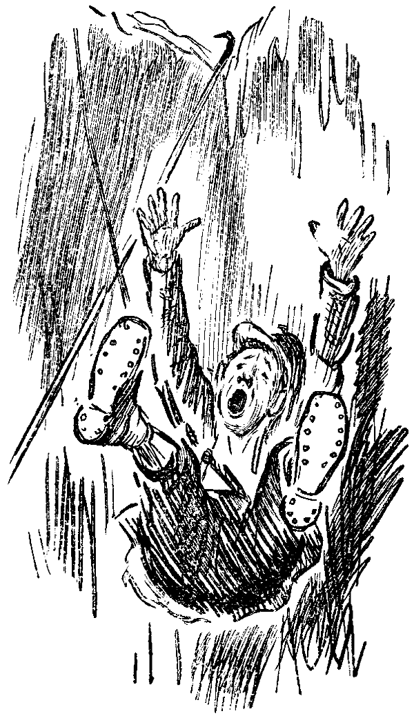 Suddenly there was an awful roar—I call it a roar, but it was really the noise of a volcano in action—and the place shook as though in the throes of an earthquake. Above me, on a rock, on the other side of a ravine (eighty feet by fifty) stood the huge monster, hideous, raging, tearing up roots, trees, stocks, stones, anything and everything. In all my life I never saw such a horrid boar! "At him, Yelpa!" I cried, giving at the same time my well-known whistle of attack. Yelpa cleared the ravine at a bound. Then followed an awful struggle. Swindlah below looked up in delight. "If the dog kills him, it's no bet!" he shouted.