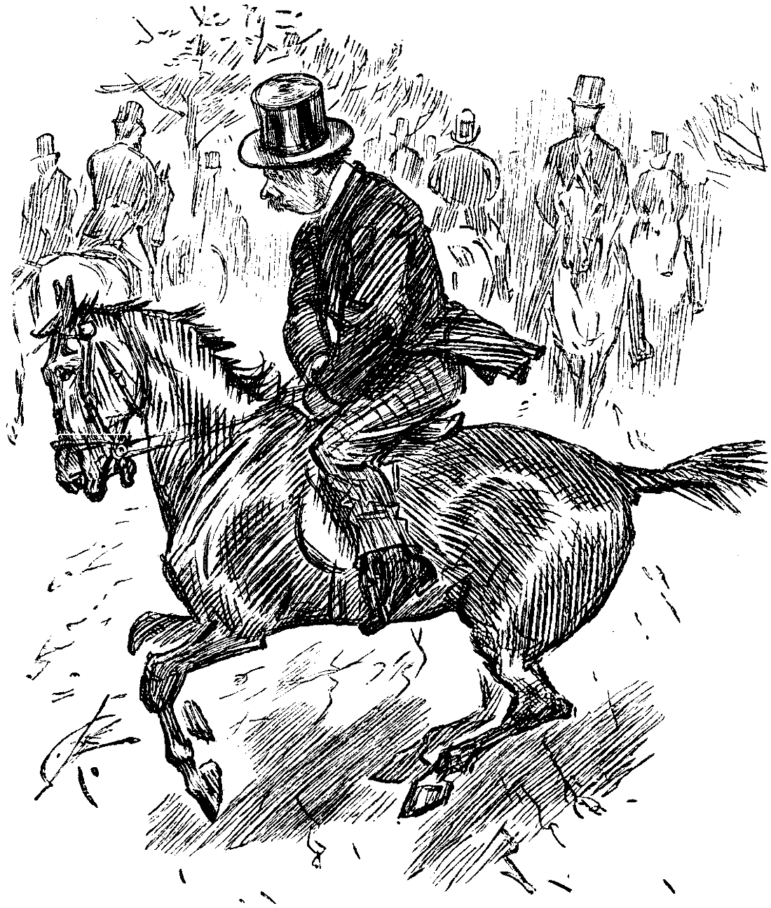 As I have said, so 'twas done. The barbarous Swindlah had determined on collaring my coin, and taking my life. He had secreted men in the jungles, in the passes, on the mountain-tops, to spear me, arrow me, shoot me,—if they could. What did I care? I had the whole country at my back, for they were ready to rise as one man—(and, as a matter of fact, only one man did rise, and he was beheaded at once by the nearest native policeman, who afterwards apologised handsomely to the family for the mistake),—and take vengeance on the tyrant. But this depended on my success; otherwise, so crushed and craven were even the noblest spirits among them, they dared not move one little finger. Shall I proceed? Yes. I bore a charmed life. The Wild Hog was wilder than ever. Mounted on my good old mare, Wheezer, which had carried me over many a stiff country in Old England, and accompanied by my faithful hound, Yelpa, I sought out the wild beast in his lair. Swindlah himself came by a circuitous route.