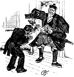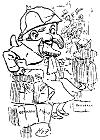 Naturally the poor natives, and the rich ones too for the matter of that, clamoured for protection at the hands of their ruler, who pretended he could see no other way of dealing with the difficulty than by raising a force of sharpshooters, armed with lances and bows and arrows, no guns being permitted, as the noise would disturb the Swindlah, who, about this time, invariably feigned to be laid up at home with a bilious headache. His subjects had to subscribe for the support of these sporting warriors, and the money came in from all quarters into Swindlah's treasury for the purpose of killing this formidable scourge. The presence of this Wild Hog obstructed trade, as no Travellers, commercial or otherwise, would run the risk of encountering this dangerous monster. Of course, the Hog was never killed, as to have put an end to its existence would have been analogous to killing the Goose that laid the Golden Eggs. When I came into the country, Swindlah did his best to entrap me. I had thirty of the narrowest escapes that ever man experienced. (Here we omit 1200 pages of this most thrilling narrative.) Swindlah had dared me to kill the Wild Hog alone: I had replied, "Yes, but it must be worth my while. So make it a bet, which will slay the beast, you or I, and I'm on. And the entire beast must be brought back as evidence. A leg, or a tusk, or an eye, or a bristle won't do. It must be the whole Hog or none."