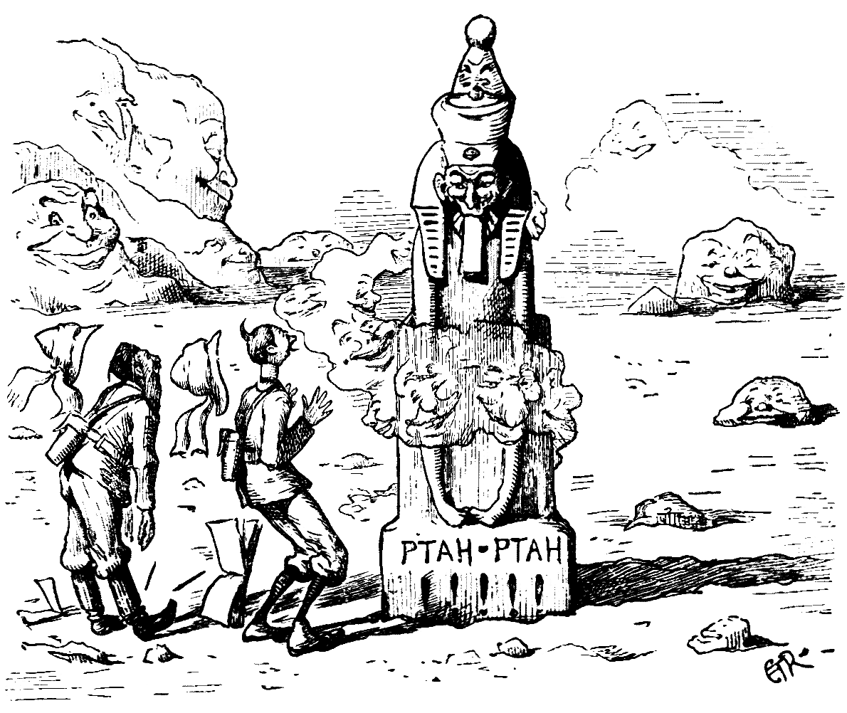 Perfectly bewildered, they threw the paper away. Then a strange thing happened. All of a sudden, with one accord, they put to the Sphinx the question that He-who-must-be-obeyed had asked them. The mouth of the head seemed to move, and one of the huge eyelids appeared to quiver. Moreover, it made a quaint gesture with the assistance of a palm-tree. Then came a voice, saying, in hieroglyphics—