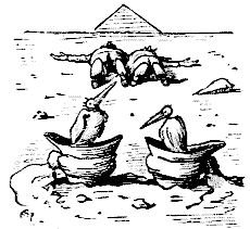 And they journeyed on and on, through the snow and the ice, until they came to the land of the desert, in which they found themselves (strange to say) in a warmer atmosphere than that to which they had grown accustomed in the regions of the North Pole. Then a strange thing happened. They witnessed a fight between an elephant and a cat. The elephant managed to get well on the bank of the river which ran (conveniently) through the desert, in spite of the cat nipping on to one of its legs. Gradually the cat began to swallow the leg, then the body, then the head, until nothing but the trunk of the elephant was left. A strange thing had happened—the elephant had been swallowed by the cat!