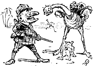 My weapons and my sporting togs are always at hand, packed for travelling at the shortest possible notice. And here let me remark to you that, when you were in the desert, had you been armed with my patent revolving, twenty-times-a-second, double-action repeating rifle, the strange story of the conflict between yourself and the ostrich would have been utterly impossible. Excuse me, Sir, but, as it is, I consider it scarcely within the bounds of probability. I know probability will take big bounds, and I'm a bit of a traveller myself, but your escape uninjured from that wild bird, and the escape also of Toby, who is not a sporting dog, is one of the strangest tales on record, by the side of which, perhaps, even the daring exploit, which I am now about to narrate as a plain unvarnished tale, may seem a mere ordinary, every-day occurrence. But to proceed.