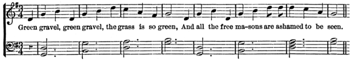 150. First printed in Ritson's "Gammer Gurton's Garland." Other original versions: (1) Gent.'s Mag., Sept. 1823; (2), (3) The Critic, Jan. 15, 1857, and (4) Feb. 2, 1857. The last mentioned is nearly identical with our B. The communicator of (1) refers it, through an aged informant, to a lady born in the reign of Charles II.; it has several more verses than the last, generally agreeing with our E, but lacks the ending. The rhyme, in England, appears at present to be known as a song only. The European rhyme is properly a dialogue, the verses being sung alternately by the warders and the approaching party; the former, whose joined and lowered arms represent the fallen bridge, do not elevate them until the negotiations are concluded. The game is, no doubt, that mentioned under the name of "Coda Romana," by G. Villani, Istorie Fiorent., A.D. 1328, ch. xcvi., as played by the boys of Florence, in which the question put to the imprisoned player is said to have been, "Guelf or Ghibelline?"—German, Meier, p. 101 (cited), etc. Mannhardt in Zeitschr. f. d. Myth., iv. 301-320, gives twenty-seven versions, including Slavic, Hungarian, Scandinavian.—Swedish, Arwiddson, iii. 250.—French, Chabreul, p. 117, "Le Ciel et l'Enfer." Celnart, p. 52, 'Le Pontlevis.'—Italian, Bernoni, p. 46, "Le Porte." Corazzini, pp. 90-93; p. 87 (a mixed form with No. 154).—Spanish, A. de Ledesma, A.D. 1605, beginning "Fallen is the bridge." See Marin, i. 166-168.—For the English rhyme, see also N. and Q., 1st Ser. II. p. 338.