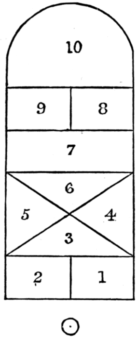 146. Strutt, p. 266. Brand, ii. 330, "Scotch-hoppers" mentioned A.D. 1677.—German, Vernaleken, p. 38, "Tempelhupfen."—Italian, Bernoni, p. 84, "El Campanon."—French, Celnart, p. 379, "La Marelle."—Hindostan, N. and Q., 4th ser. IV. 93.