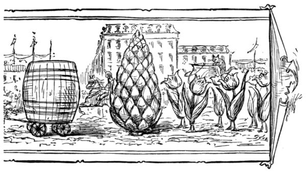 Next a huge pot, with a cat climbing its side, her paw just thrust beneath the lid. Ha! it suddenly flies off. Does the cat enter? We cannot see through the crowd. A colossal stump follows, trailing with mosses and vines. Upon it a bird's nest filled with young, their mouths wide open for food; wonderful, because the artistic skill is so perfect that, although so immense, they seem living and not unnatural.