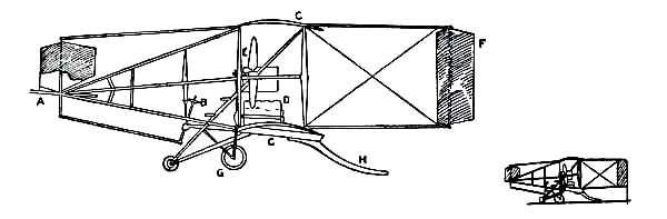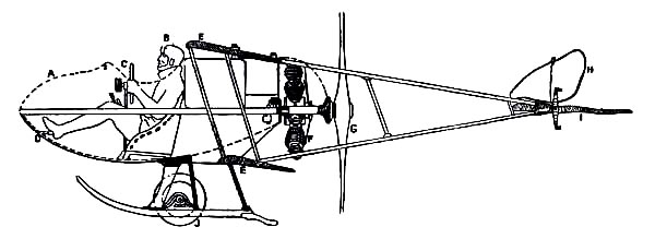 A. Enclosed body; B. Driver’s position; C. Steering wheel; D. Foot-controlled throttle lever for engine; E.E. The two sustaining-planes; F. The motor; G. Propeller; H. Rudder; I. Elevating-plane; J. Landing gear.