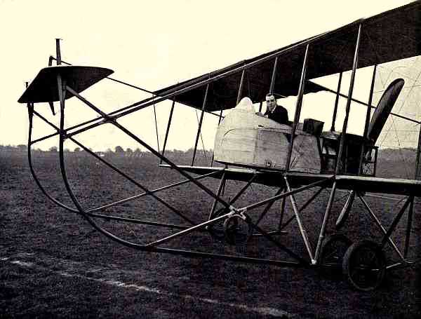 This machine, which is seen above with Mr. Grahame-White at the steering wheel, holds a world’s record for weight-lifting, having flown for 19 minutes at Hendon, carrying nine passengers. The craft has a wing-span of 60 feet, and is driven by a motor of 100 horse-power.