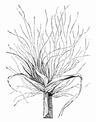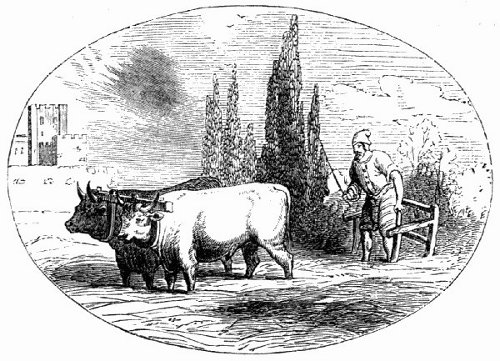 "Passing some cemeteries and public fountains, we came to the outskirts of the city, which consist chiefly of gardens producing olives, oranges, raisins and figs, irrigated by creaking water-wheels worked by donkeys. To one of these the droll contrivances which attracted our notice was affixed. The donkey who went round and round was blinded, and in front of him was a pole, one end of which was fixed to the axle and the other slightly drawn towards his head-gear and there tied: so that, from the spring he always thought somebody was pulling him on. The guide [Pg 682] told us that idle fellows would contrive some rude mechanism so that a stick should fall upon the animal's hind quarters at every round, and so keep him at work whilst they went to sleep under the trees."