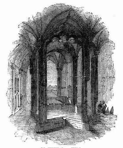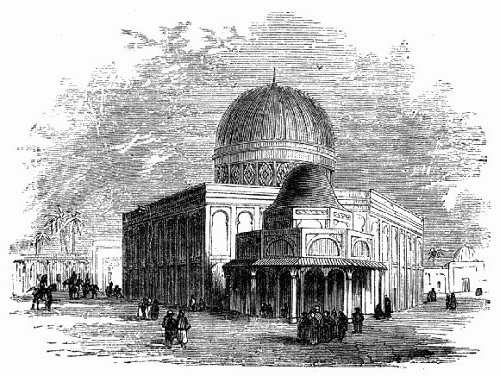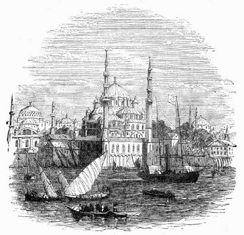 "I have said it was Friday; and so, on my return, I had an opportunity of seeing the Dancing Dervishes at Pera. They exhibit—for it is rather a sight than a solemnity—on this day, as well as on Tuesday, in every week. Their convent is facing the scrap of burying-ground on the road from Galata to Pera, and any one may witness their antics. Having put off our shoes, we entered an octagonal building, with galleries running round it, and standing places under them, surrounding the railed enclosure in which the Dervishes were to dance, or rather spin. One division of this part of the building was put aside for Christians, the others were filled with common people and children. When I arrived, one old Dervish, in a green dress, was sitting at one point of the room, [Pg 670] and twenty-four in white, were opposite to him. A flute and drum played some very dreary music in the gallery. At a given signal they all fell flat on their faces, with a noise and precision that would have done honour to a party of pantomimists; and then they all rose and walked slowly round, with their arms folded across their breasts, following the old green Dervish, who marched at their head, and bowing twice very gravely to the place where he had been sitting, and to the spot opposite to it. They performed this round two or three times. Then the old man sat down, and the others, pulling off their cloaks, appeared in a species of long petticoat, and one after the other began to spin. They commenced revolving precisely as though they were waltzing by themselves; first keeping their hands crossed on their breast, and then extending them, the palm of the right hand and the back of the left being upwards. At last they all got into play, and as they went round and round, they put me in mind of the grand party we have seen on the top of an organ, where a cavalier seul revolves by himself, and bows as he faces the spectators.