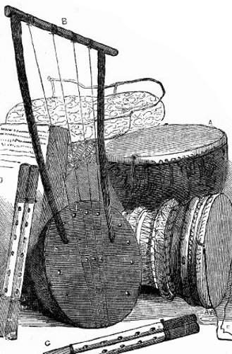 The music of the Hindoos includes eighty-four modes, each supposed to have a peculiar expression, capable of moving some particular sentiment or affection. The modes take their denomination from the seasons, or from the hours of day or night. Musical composition is supposed capable of adaptation to the different periods of the day, and therefore its provisions are regulated by the hours. The ideas of the Hindoos on music, as promoting the pleasures of imagination, may be inferred from the names applied by ancient authors to their musical treatises. One is called Rágárnava, the Sea of the Passions; another, Rágaderpana, the Mirror of Modes; and a third, Sóbhavinóda, the Delight of Assemblies; a fourth, Sangítaderpana, the Mirror of Song; and another, Rágavibódha, the Doctrine of Musical Modes. Some of these works explain the law of musical sounds, their divisions and succession, variations of scales by [Pg 684] temperament, and the enunciation of modes; besides a minute description of the different vínás (lute), and the rules for playing them. This is a fretted instrument of the guitar kind, usually having seven wires or strings, and a large gourd at each end of the finger-board. Its extent is two octaves, and its invention is attributed to Náredá, the son of Brahma. There are many varieties, named according to the number of their strings. Of one of them we give an engraving below.