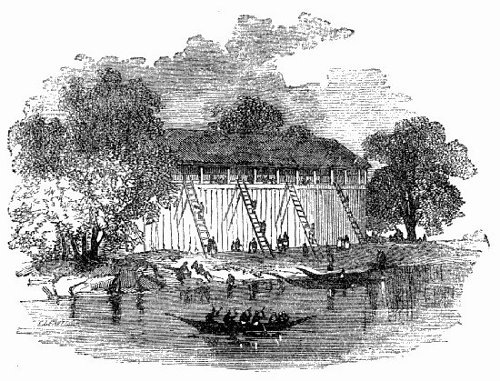 "The most peculiar part of the arrangement of these vessels is in the spars and rigging. The mast consists of two spars; it is, in fact, a pair of shears, bolted and lashed to two posts rising out of the keel-piece, so that it can be let down, or unshipped altogether, with little difficulty. Above the mainyard the two pieces run into one, forming the topmast. Wooden rounds run as ratlines from one spar of the mast to the other, forming a ladder for going aloft.