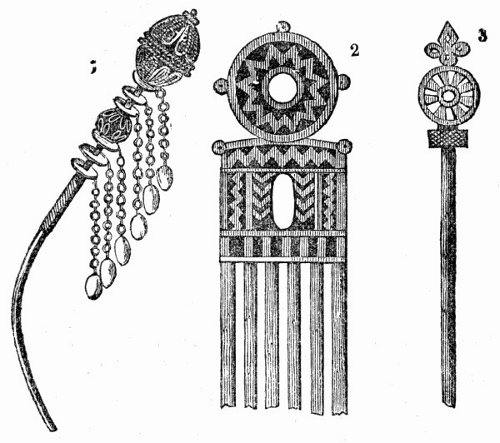 If we look backwards to the most remote times of Greek industry, we find that long before fire-casting became customary, almost every kind of work was carried out by the simple means of the hammer and tongs, wielded by skilful hands. Even products of art were created in this manner; and as statues, vases, and the like could not be put together by the process of soldering, nails were used for the purpose, as we learn not only from ancient writers, but even from monuments which have lately been discovered in Etruria, and the most important specimens of which are now possessed by the British Museum. In one of the tombs belonging to the vast necropolis of Vulci were discovered, about twenty years ago, a great many bronzes of this very ancient workmanship; one of them represents a bust placed on a basement covered with thin copper plates, and adorned by a row of figures, which are likewise chased; long curls fall down over the neck and shoulders, and these parts especially are formed in the most simple manner: one would be tempted to call it child-like, did not the whole composition show a certain character which enables the experienced eye of the art-philosopher to distinguish in these rude attempts at plastic metal work the very germ of those wonderfully-styled productions of a later period. The engraving here annexed, giving a side view of this remarkable, and as yet unique monument, is intended to show the arrangement of the hair, which, in spite of its simple treatment, presents as a whole some trace of grace, and principles of fine proportions. We perceive that the curls are formed by rolling and twining together small strips of bronze plate, connected with the head itself by the mechanical means we have alluded to. There is no trace of soldering; and we may be sure that we possess in this figure a good specimen of those hammer-wrought sculptures of old which were spoken of by the Greeks themselves as belonging to a fabulous period.
