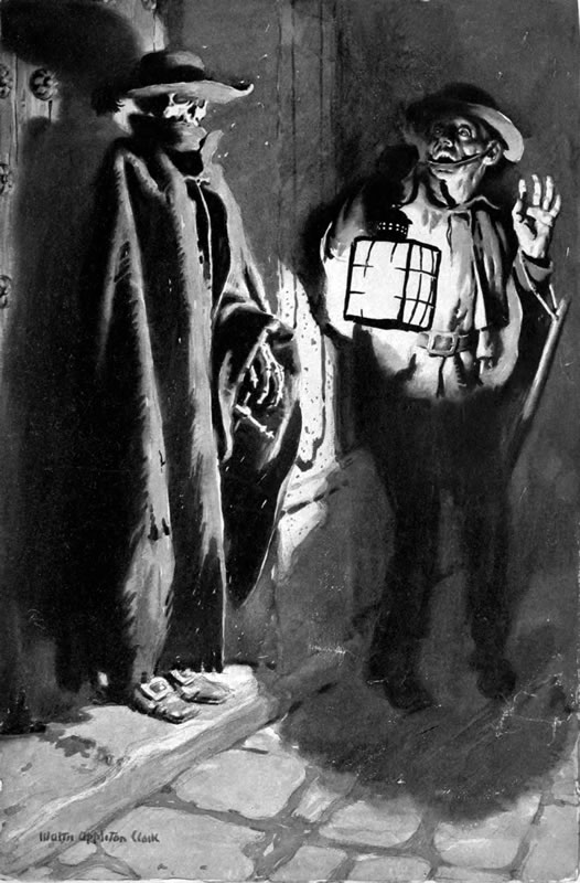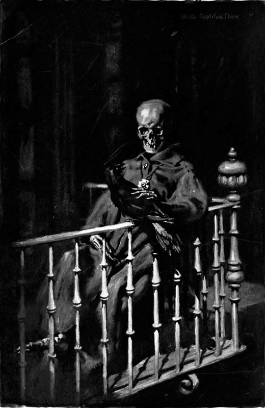 Brother Mendo, a worthy and kind-hearted friar, is met of a dark night in the street by a man who begs him to come and hear a dying person confess. The friar wears the habit of his Order, and from his girdle hangs his rosary. He is led to a house near by; and finds within the house a very beautiful woman, richly clad in silks, whose arms are bound. That she is not in a dying state is obvious, and the friar asks for an explanation. For answer, the man tells him roughly: "This woman is about to die by violence. I must give[Pg 158] her death. As you please, wash clean her sinful soul—or leave it foul!" At that, he yields, and her confession begins. It is so prolonged that the man, losing patience, ends it abruptly by thrusting forth the friar from the house. Through the closed door he hears shrieks and tries to re-enter; but the door remains closed firmly, and his knocking is unheeded. He finds that his rosary no longer is at his girdle. In order to recover it, and to allay his fears for the woman's safety, he calls a watchman to aid him by demanding in the name of the law that the door shall be opened. No response is made from within to their violent knocking; and an old woman, aroused by it, comes out from a nearby dwelling and tells them that knocking there is useless—that through all her long lifetime she has lived beside that house, and that never through all her long lifetime has that house been inhabited. The watchman—holding his lantern close to the door, and so perceiving that what she tells is verified by the caked dust that fills its crevices and that clogs its key-hole—is for abandoning their attempt to enter. The friar insists that they must enter: that his rosary is within the house; that he is determined to recover it; that the door must be forced. Yielding to him, the watchman forces the door and together they enter: to find a yellowed skeleton upon the floor; scattered around it scraps of mouldering silk; in the eye-sockets of the skull cobwebs—and lying across that yellowed skeleton is the friar's rosary! Brother Mendo covers his face with his hands, totters for a moment, and then falls dying as he exclaims in horror: "Holy God! I have confessed a soul from the other life!" And the crowd of neighbors, by that time assembled, cries out:[Pg 159] "Brother Mendo is dead because he has confessed the dead!"