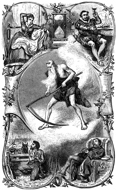 The poets are our best interpreters of Time, and they seem never tired of referring to it and symbol[ 4]ising it by every possible figure, emblem, and trope.[1] Celerity of motion and brevity of duration are discovered to be its chief characteristics. Time is therefore depicted as flying,—fast, noiselessly, and uninterruptedly. It is a river, speeding on with imperceptible but resistless pace to the ocean of eternity. It is a stern vigorous old man—Time is already old—rushing by us with never-slackening strides, bearing blessings for each and all, but we must be upon the alert to strive with him for his gifts—'to seize Time by the forelock—'or he will forget to bestow them.