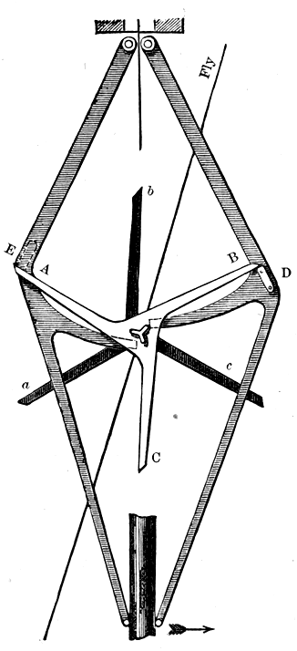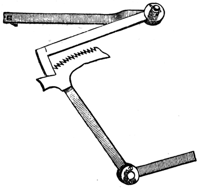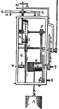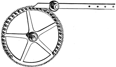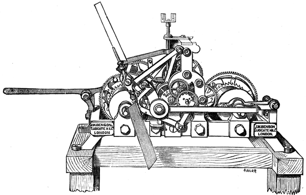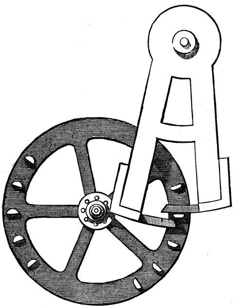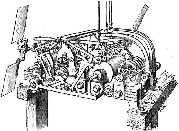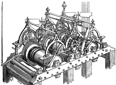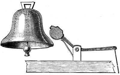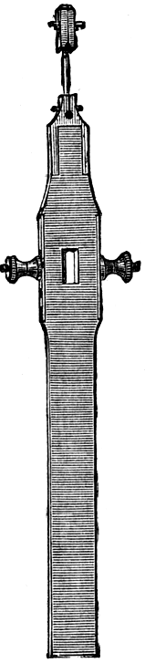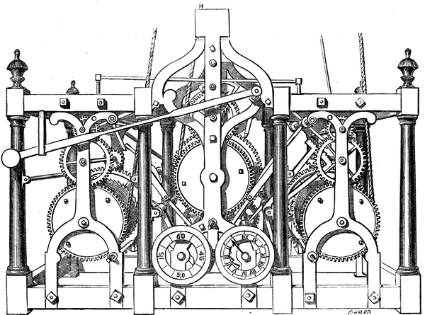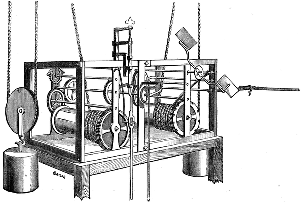 One was erected recently upon the new principle, of which the cost was something under £5000,[ 182] including 12 bells weighing from five to seven cwt. each, clock, architect's charges, gas-fitting, and £1200 for timber-trussing, floors, &c. The Carillon machine is let off by the clock and plays seven times on the ringing peal of bells, but is adapted to play twenty-eight tunes on fifteen bells. It is wound up every morning and plays eight times in twenty-four hours, i. e. once every three hours, giving the tune on each occasion three times, and occupying about four minutes in doing so. At the expiration of the 24 hours the tune changes involuntarily, and of course with seven tunes there is one for each day in the week. The Carillon machinery is connected with the clock and set in motion thereby, by a lever which at three hours' intervals dislodges a pin and allows the weights, 14 cwt. each, to act upon the machinery, the speed being easily regulated, as in clockwork, by revolving vanes. The barrels are five feet long, by one foot in diameter, and are studded with brass pins like that of a musical box. When the bells are required to be rung, a bar is turned down on the keys which prevents the motion of the machinery for any length of time that the ringing is to be continued. Notwithstanding that the twenty-six hammers weigh from 2 cwt. to 70lbs each, it is possible that the tunes could be played by means of an ivory keyboard, as in a church organ, and with almost as much ease and facility.