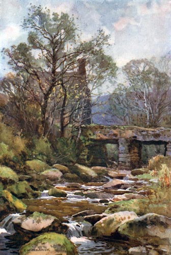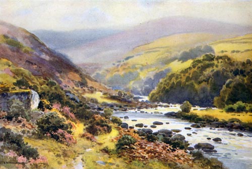 We are by the side of a free moorland water, gliding and gurgling and whispering through a valley-bed of rugged and weeded crags, with trees that make a chequered network of the sunlight. It is a paradise of coolness and peace, where there are mossy boulders on which we can rest, or couches of fern and turf on which we can lie. The constant yet changeful music of the waters is in our ears; our eyes are soothed by the sweet umbrage of the branches, conveying the light with an alchemy that transmutes it into a green-tinged wine. Sometimes the water takes an amber tint, coloured by the fragments of rock that in almost any part form stepping-stones from side to side. In winter no such passage would be easy; the brook becomes an angry torrent, leaping with foam and impetuous fury down the rock-strewn gorge: but that which at times can become a relentless giant, at other times is like a playful nursling; the child prattles where sometimes the Titan thunders. There are miniature cascades and tiny waterfalls; the stones that are nothing to the swollen winter stream now cause its baby current to swerve and deviate, seeking for fissures that permit its flowing. It is delightful to lave one's feet in the clear tide, but the weeded stones are slippery and the bed of the stream is rough; this is no quiet sandy brooklet that children may wade in. It does not dally, but flows with a swift current of life. Many of our typical English streams are almost or quite voiceless in their course; we have to bend our heads to catch the low monotone of their flowing. But here is no pastoral brook meandering through meadowy lowlands; it runs with a gush and a tinkle; even in hot days, when the current is slender, there is always spirit and vigour about it. For an angler there is something even better: trout lurk in some of the deeper holes. Truly the desolation of the moor is not to be found by its riversides, unless it be in their boggy cradles. Here by the young Dart is a plentiful growth of trees and luxuriance of plant life; the boulders are draped with weeds and water-mosses. There is variety also in the colouring of the lichens; and in their due season who shall describe the glory of the flaming ferns, the gold of the gorse, the purples of ling and heather? This is the moor and the river in their gentler aspects; there are times when both become a fierce passion, a wild dream, almost a horror.