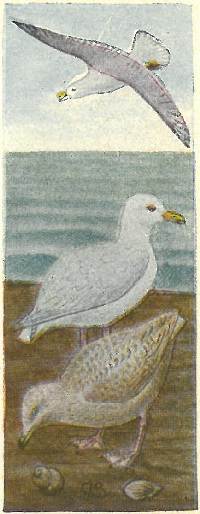 This is one of the largest of the Gulls; mantle light gray; it is distinguished by its size and the primaries, which are white to the tips. It is a powerful bird that preys upon the smaller Gulls, eating both the eggs and young.