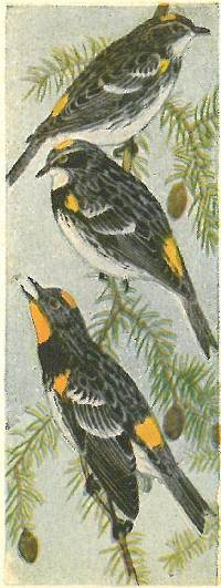 Range.—Most of North America. On the Pacific coast, it is found from central Oregon to southern California. It is quite commonly known as the Yellow-rumped Warbler, both in the east and west. They differ from the following, mostly in the throat markings, this one having a white throat and much more black on the head and breast, while on the following the throat is yellow. They nest in the lower branches of coniferous trees, making it of grasses, rootlets and fiber, in which they lay usually four eggs, white, spotted with shades of brown and lilac, more heavily about the larger end (.70 × .50).