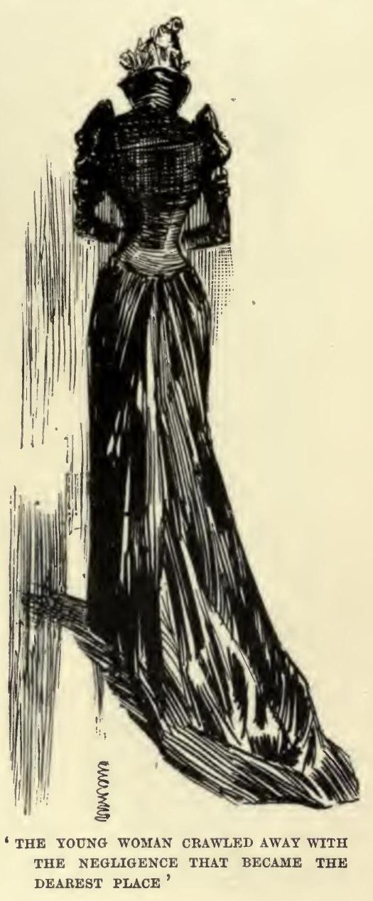 The weather looked threatening as we drove off, precisely at twelve o'clock, and presently it began to rain with great industry and determination. The drops came streaming down outside the carriage windows; fewer people as we passed leaned out of hansoms to look at us. Inside the Mafferton carriage we were absurdly secure from the weather; we surveyed our trains, piled up on the opposite seat, with complacency; we took no thought even for the curl of our feathers. We counted, as we drove past them to take our place, and there were forty carriages in line ahead of us. Then we stopped behind the last, in the middle of a wide road, heavily bordered under the trees with damp people and dripping umbrellas—there for the spectacle. All kinds of people and all kinds of umbrellas, I noticed with interest—ladies and gentlemen, and little seamstresses, and loafers and ragamuffins, and apple-women, and a large proportion of your respectable lower middle-class. We sat in state amongst them in the rain, being observed, and liking it. I heard my roses approved, and the nape of my neck, and Lady Torquilin's diamonds. I also heard it made very unpleasant for an elderly young lady in the carriage in front of ours, whose appearance was not approved by a pair of candid newsboys. The policemen kept the people off, however; they could only approach outside a certain limit, and there they stood, or walked up and down, huddled together in the rain, and complaining of the clouded carriage windows. I think there came to me then, sitting in the carriage in the warmth and pride and fragrance and luxuriance of it all, one supreme moment of experience, when I bent my head over my roses and looked out into the rain—one throb of exulting pleasure that seemed to hold the whole meaning of the thing I was doing, and to make its covetable nature plain. I find my thoughts centre, looking back, upon that one moment.