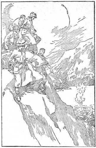 A few moments later, Chunky’s rifle spoke. In the meantime Tom and Hippy had been shooting at the boat, taking their time, aiming with deliberation, until finally the fire became too hot for the men in the dugout, and they paddled rapidly shoreward to the other side of the lake. Soon after their arrival there they began to shoot at the cave-mouth. Hippy and Tom then turned their rifles in that direction, but with what result they were unable to determine.