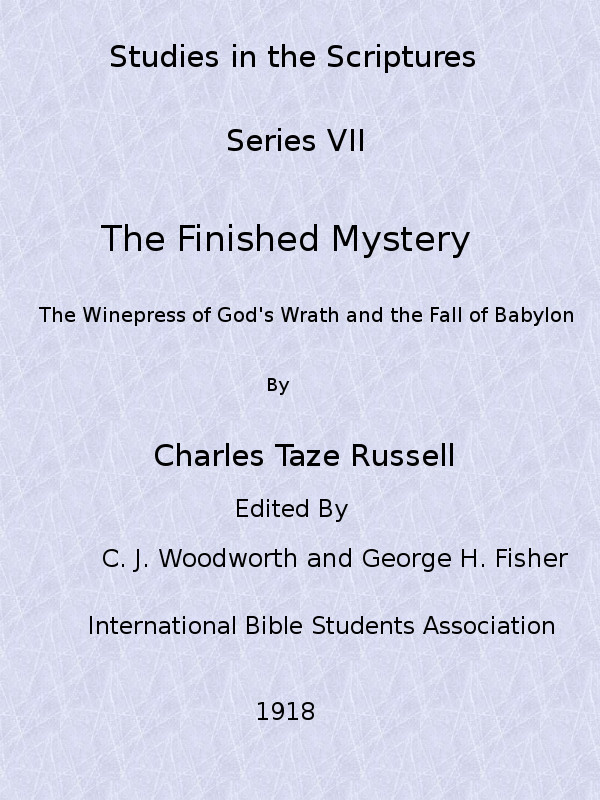 It seemed pleasing to the Lord that Brothers C. J. Woodworth and George H. Fisher should prepare the Seventh Volume, under the direction of the WATCH TOWER BIBLE AND TRACT SOCIETY. While both residing in the same city, they have worked separate and apart from each other, not even comparing notes. The reader will be able to judge how fully the work of each harmonizes with that of the other and with the Divine Plan, thus giving further evidence of the Lord's direction in this matter.