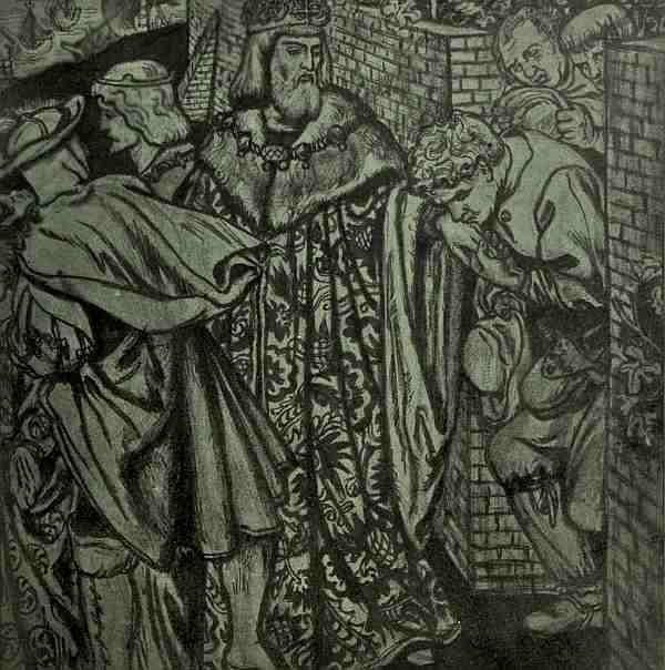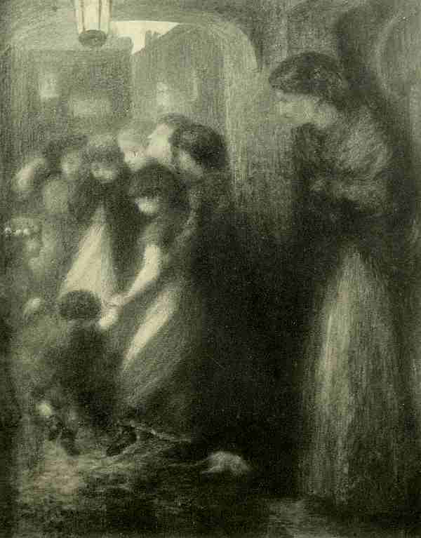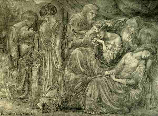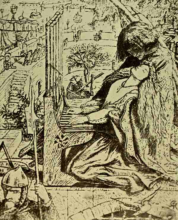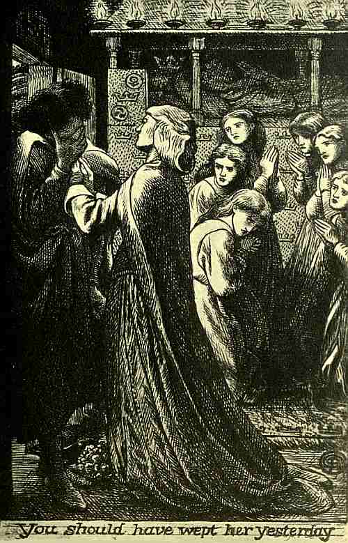 You should have wept her yesterday was done as an illustration to one of his sister's poems. It represents the return of the Prince after many delays to find his lady has died, believing him unfaithful. The ugly drawing of the Prince spoils an otherwise beautiful design. This ugliness is only compensated for by the six girls who turn their pitiful eyes so naturally from their prayer to look towards the Prince. The grace of girlhood in their faces must come as a revelation to some of Rossetti's critics.
