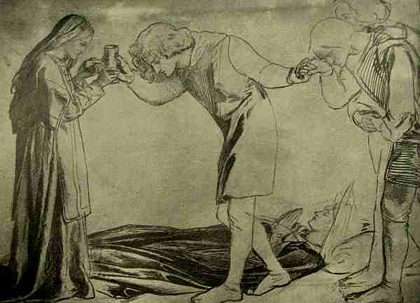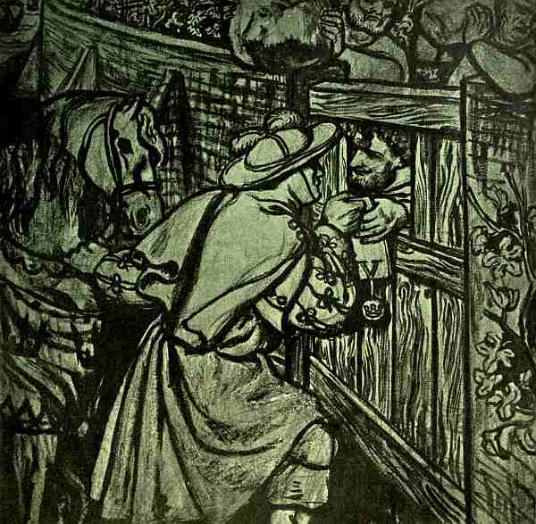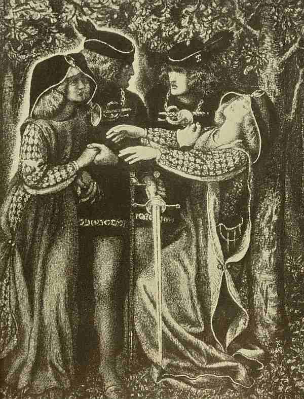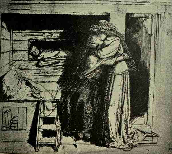 Turning to the illustrations, that called A Drawing for a Ballad with its free and loose handling, its qualities of selection and emphasis, show how great in many ways Rossetti was. What lines could be simpler than those in the girl's dress? In such a sketch as this, in the little things, Rossetti is masterly, and one cannot here separate what he has to say from the saying of it. This sketch shows an artist great enough to be unpretentious, and it shows that the happy qualities of mind, united with its craft, sprang from his habits of thought. We see in it with what natural tenderness he has sketched, how by one of the girl's hands her companion's face is lifted to the kiss. This naturalness holds the secret of Rossetti's power. His art was consciously set on decoration, but this is not a decoration; in all that he has read into the miniature faces and in the embracing of the hands, we get in this sketch more intimately than anywhere else evidence of his great heart. This dramatic sympathy would attract every one could it shine more often through the carelessness, the unhappiness, that at the end obscured it. In this way we must think of Rossetti as a failure, and a great man cannot fail once without blinding the world to his many successes. Had Rossetti possessed [Pg 13] no sense of colour, and had he not completed many large pictures and elaborate illustrations, but only followed this one path as far as he could go, doing only such things as this, without being a poet and without being a painter, who knows to what extent we should have praised him for these slighter things alone? There is no doubt that we expect so much from him, and he has given us so much in other ways, that we forget the treasures hidden here. One could wish that he had always worked in his drawings with the freedom indicated in this sketch, but it was not the fashion then. Work in Rossetti's day had to come into the market elaborated to the point of its soul's extinction in order to be taken seriously. Now that we have taught ourselves always to value first any indication of the spirit, what would we not give to possess ourselves of work by this artist in impulsive drawings, and it must have been within Rossetti's power to do them down to the last.