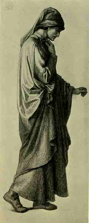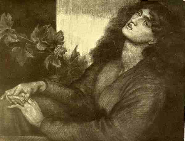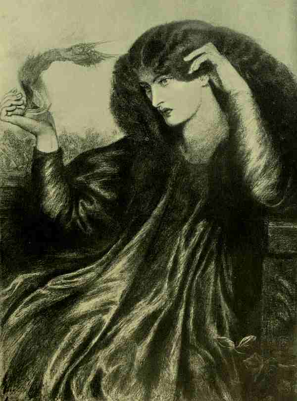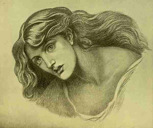 The figure of the Magdalene gains in many ways as completed, and though the distressed loving face and the flowing hair of the sketch are changed, the alteration of the expression on the face from one of intense distress to one of proud determination is very interesting as showing how his subjects grew and changed under his hand. It is wholly to the gain of the picture the different gesture which he has arrived at in the second drawing, where the Magdalene with both hands throws the flowers from her hair. The dramatic quality upon which we have insisted as part of Rossetti's art is nowhere better shown than in the deer quietly eating leaves from the wall, all unconscious that there is acted out beside it the most pathetically beautiful drama of the world. One misses in the finished picture some of the sensitive drawing given in the sketch to the Magdalene's dress. Here, instead, her clothes are as if she were perfectly still; they give no indication of her movements and the stormy action round her. That is the fault of Pre-Raphaelitism—to fritter away the spirit for the sake of the embroidery upon the body's clothes; to lose emphasis in elaboration, to sacrifice a greater beauty for a meaner one.