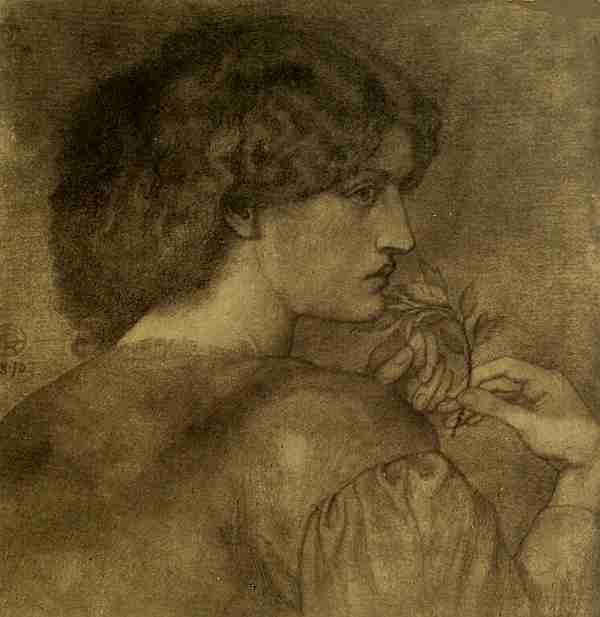 In comparing the study for Christ at the House of Simon the Pharisee with the completed drawing, the question arises whether, with the elaboration that has come into the latter, some of the intensity of the study has escaped; or whether, on the other hand, the subject has gained. The simplicity of the first undoubtedly possesses something which is subsequently lost in elaboration, and yet taking the completed picture and looking into it one finds a lesson in Rossetti's methods. We find that by dwelling upon his subject he has emphasised certain notes, has repeated as it were a refrain, and made more spirited and poetic in rendering the figure of the lover in the foreground. After-thoughts have given every touch that could possibly enrich, and, at the same time concentrate, dramatic motif in this figure. The embroidery on his coat, the flowers in his hair, the hair itself, and the face so mocking and fascinating and sure of itself, is more in the spirit of the subject than the gentler face as it appears in the sketch.