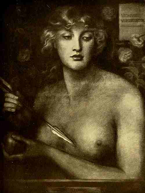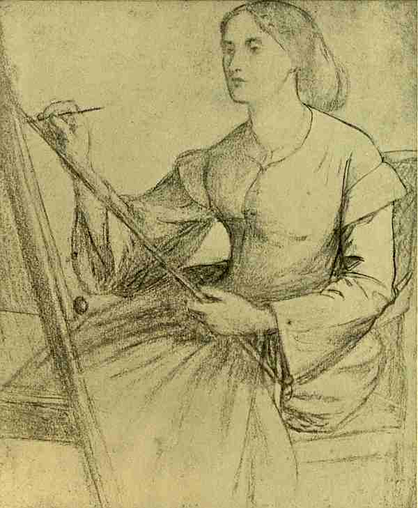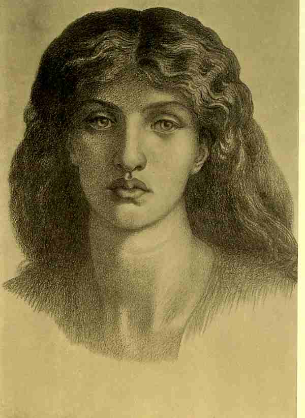 Rossetti could not learn painting instinctively as he learnt writing; for him the materials were not so simple, they remained during a long apprenticeship an obstacle rather than an aid to impassioned expression, and from his apprenticeship he never emerged into anything approaching freedom. Upon the vivacity of the imagination in them, and not upon subtlety of line or of observation, the claims of Rossetti's drawings rest, though it is wonderful how often he lifts his art up to the level of all that he has to say and imposes upon us a forgetfulness of its shortcomings. His studies do not reveal a master who looked upon objects and beautiful forms for their own sake and for the sake of the tender drawing he could find in them. Rossetti, indeed, loved a visible world, and liked to interpret the beauty of natural objects, but he was always in haste to get the scene set where such objects were, after all, for him only as accessories to the thing enacted, or as notes in an orchestration; of value but not existing by themselves. He gave to every object the import of the drama in his mind; in his art things seem to have about them the meaning lent them by an imagination that spiritualised objective things so that they seem there in essence only and rendered with a sympathy that shows how alive to the significance of outward beauty Rossetti was, and how his own time and every-day surroundings were fused and blent with his most far-reaching imaginings. To turn to outward things, and to study them as merely offering various surfaces to the light, holding depths of shadow, possessing lines of delicate shape, was, however, impossible to his temperament. The characteristic story of Madox Brown setting in early days the young Rossetti down to paint such still life as jam jars, and of the young painter's impatience, shows that to paint or draw the objects for their own sake only was not congenial to him. There was very likely sufficient of the true painter in Rossetti to make such study a delight, had his mind ever been still enough for his hand to playfully carry out such problems; but always at the back of his mind, at the back of the world for him, a strange drama of love and beauty went on. How then could time be spent in studying what, after all, were merely objects, how could time be spent in deliberating over the study of them? And so the drawings which Rossetti left us are seldom studies of poses and draperies, such elaborate scaffolding as [Pg 12] that upon which the art of Burne-Jones was built. They are little pictures in most cases, in which the pencil or the pen afforded a readier and less laboured means of realising quickly the life dramatic of imagination.