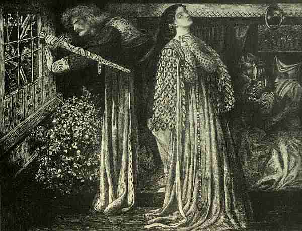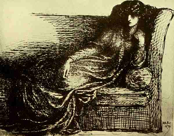 The drawing of the death of Lady Macbeth is one of the most wonderful things Rossetti ever did, and it is characteristically marred by imperfect drawing. The drawing is of great quality throughout, except for the figure with head averted. Some wonder why the ability to make the rest of the picture perfect failed the artist here. It is probably because the action of each figure is controlled only by the imaginative impulse that sways the whole composition, that gives to every part of it dramatic intensity as if executed all in one mood, bringing in one moment of creation the whole to life on paper. Those in sympathy with the nature of Rossetti's art do not count this piece of bad drawing a disastrous flaw. The rarity of genius makes them accept everything gratefully; it disarms a cavilling attitude. The fault in their eyes even seems to add to the tense note struck as a changed note in an over sweet harmony. Its dissonance breaks the monotonous rhythmic decoration, and its harshness relieves the detail so delicately wrought. Rossetti is of the extreme few who have finished minutely without sacrificing the qualities of greater significance than finish. His art is great enough to make us forget the detail and to render us for the time oblivious of it. In our absorption in the subject it seems for a time not to exist, only the tense mood exists, the intense moment. In a picture in which the moments are aflame with tragedy Rossetti drew this figure moving slowly and with decorative convention. All the figures are controlled by such a convention; they are partaking in a high drama. Such a convention as Irving has in the art of acting gives something to the dignity of tragedy. The conventions of Rossetti too are so much in the spirit of high [Pg 14] art, they conform so well to the claims of art, that they lend beauty to that power of his of giving to his drawings dramatic perfection. In regard to the particular figure of which we write it is better, faulty as it is, than if it had been redrawn in another mood and given again to the picture. It is to be regretted, of course, that it did not come rightly as it is, but it is less to be regretted than if he had substituted dead perfection for living imperfection, a studied and acquired idea of the pose in place of the instinctive one.