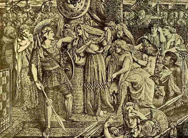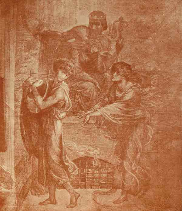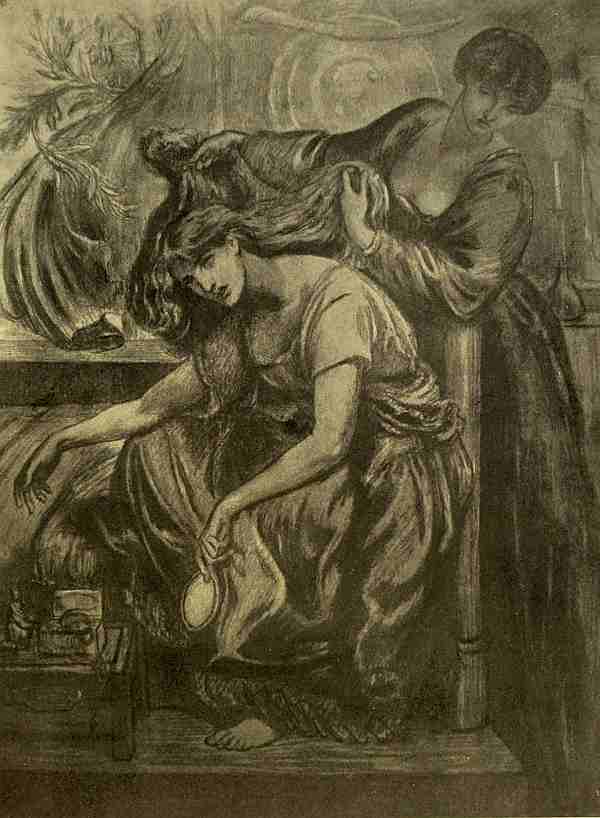 The first illustration for Desdemona's Death Song is simply a rough sketch, but even taken as such it shows how blind or how careless in the matter of form Rossetti at times could be. Here the lower part of the figure is so obviously lacking in proportion that it prevents us accepting an otherwise characteristic drawing as such. Still of Rossetti's best moments is the controlling grace of the bend in the maid's wrist, and the movement of her head as she combs Desdemona's hair. The curtain blown into the room by the wind is one of those touches Rossetti gives everywhere; by insistence on such an incident he makes us live the moments depicted in his pictures—just as we find ourselves in moments of extreme tension watching eagerly something absolutely trivial and making some accident portent with meaning.