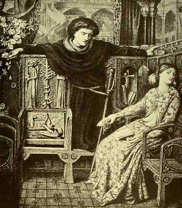 Like all those in whose art we find phases of an extraordinary beauty Rossetti could often draw in the most uninspired fashion, presumably where his interest flagged. In the drawing of Hamlet and Ophelia, Ophelia is charming; but it is with difficulty that we are reconciled to the Hamlet; it is difficult even to understand in what position the figure is standing; not that this indefiniteness often matters in art, but here, where everything else is so precise, it provokes dissatisfaction. From Rossetti alone could have come the background with the winding ways parting and meeting rhythmically with steps up to the bridge. Such architecture as this, and all the quaint furniture in his pictures, were designed by himself. From his facile imagination anything might come. Certain objects that were full of associations of old things he returned to often in his drawings, such as old Books of Hours with all the sentiment that many hands had given to them. The niche in the picture containing the Crucifix and the Breviaries is significant of the Religion in Rossetti's art. This was his religion, to think of Divine things by the legends of a romantic Church. [Pg 15]