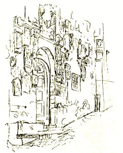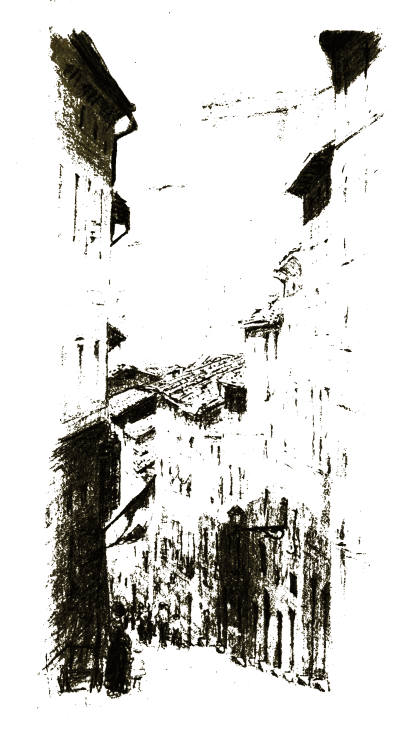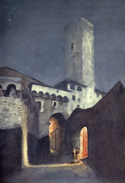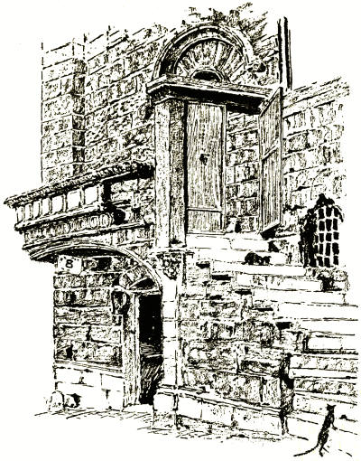 But the chief glory of Viterbo is the romantic mediaeval city which lies between the Via Principe Umberto and the gates of the Carmine and San Pietro. Here even the names of the narrow and mysterious streets have not been changed by the rise of the House of Savoy. Would it not give a thrill even to the most unimaginative of travellers to step from the Square of the Dead into the Via di San Pellegrino with its grey thirteenth-century houses huddled on either hand, now flowering into Gothic windows and elegant outside staircases, now frowning defiance from square fighting towers with evil slits for eyes, now opening a passage down the steep hillside like the Street of a Hundred Bridges or the staircase street which leads to the Bridge of the Paradox?