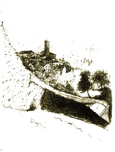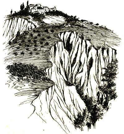The way was strewn with flowers, like all the paths of Umbria, and it led us through the undergrowth at the foot of the rock of Orvieto to the olive garden of the Mancini Necropolis. Barren figs sprouted from the gaping crevices overhead, and sometimes the bearded ivy hung half-way down the cliff. Once we came upon two rude wooden crosses nailed to the brown tufa, with the marks of a third between them, making the desolate valley more like a Golgotha than ever.