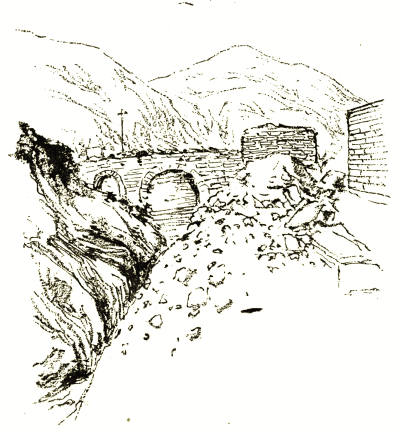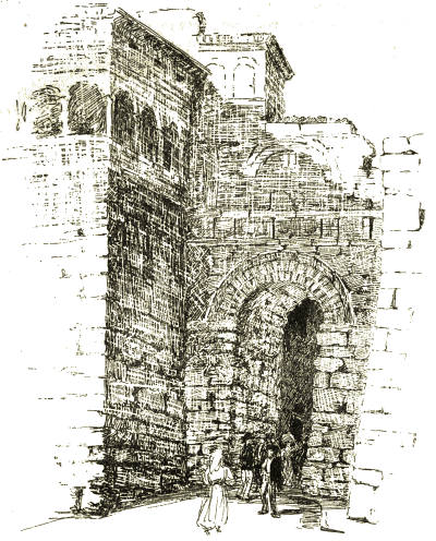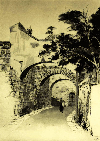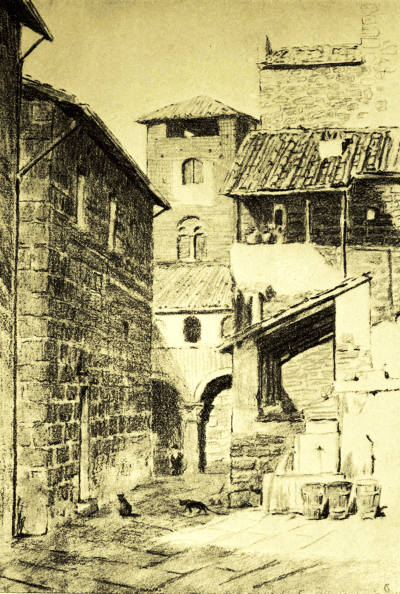 It was very early when we emerged from the frowning gate of the city and dipped down among the dewy vineyards. Beside the road an aqueduct rose out of the earth, a crumbling mass of ancient masonry. As we climbed down into the valley it towered above us, spanning the ravine, but when we toiled over the penitential stones of the Via dei Cappuccini, thankful for its shade as we mounted, it sank again into the hillside, and the leaping green things clambered upon it, eager to drag it back to the ditch. So we went leisurely through the play of light and shade, and always as we looked back we saw Orvieto rising sheer out of the valley like a queen on her brown rock. The morning mist wove a magic beauty round the spires of her Gothic cathedral and the giant pine-tree on the edge of her precipice, until she seemed the very city Turner immortalised.