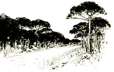 To our right Tivoli was hidden in mist, but Rocca del Papa and the Alban Mount rose like shadows to the south. The aqueducts marched across the plain, or stumbled into ruin among the flowers with which the merciful earth covered their fall. Lonely farms, towers, nameless tombs, grew out of the folds of the plain. And the early setting October sun, dipping into a haze, empurpled the fields and wove a golden halo round the sheep who bleated homewards in the melancholy of the dying sky. The little trees, like mourners, bent down towards the tombs, or seemed to shrink back to the earth. Only the stone pines with their heads to heaven were unconscious of the death around their roots.